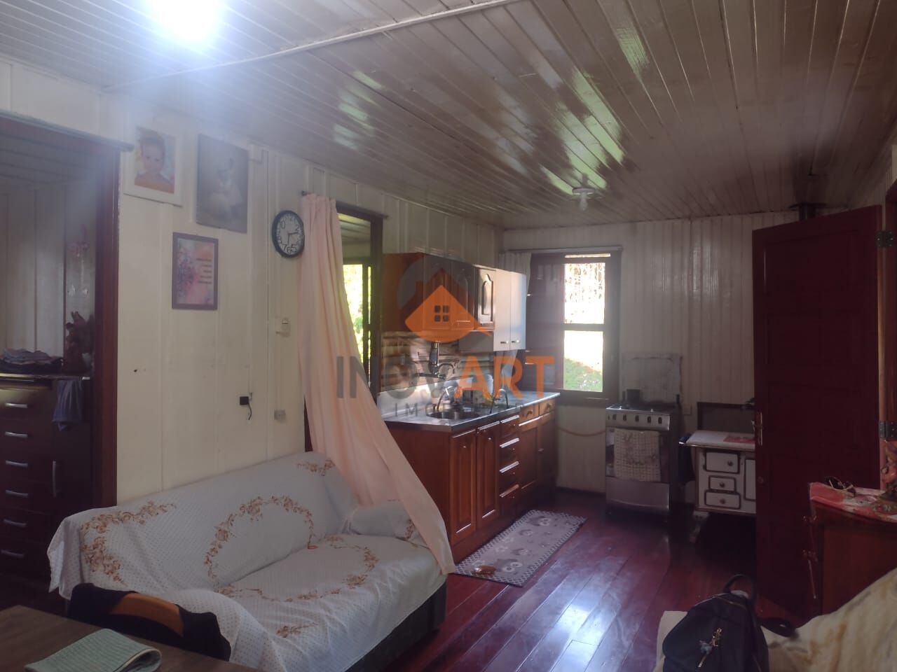 No terreno tem uma casa de madeira de 3 quartos, a qual nela permearia todos os móveis , ficando pronta para morar
